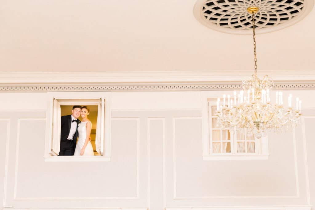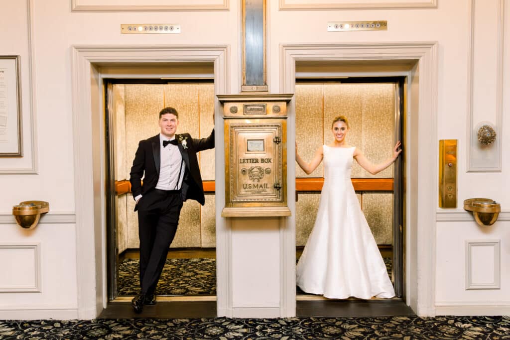 Once vows were exchanged, it was time to head back to the Hawthorn Hotel’s ballroom for the reception, which was nothing short of stunning. As the evening unfolded with heartfelt toasts and lots of dancing, there was a perfect opportunity for a little adventure. We sneaked away for some unique portraits within the hotel. The hotel's charm didn’t disappoint. From the grand staircase that wound its way up in elegant curves to a tiny window overlooking the ballroom, we found some fantastic spots that added a touch of whimsy and character to the collection. But my absolute favorite moment from this Hawthorne Hotel wedding came when we took a few portraits by the vintage elevator. The aged, brass door and intricate details of the elevator made for the most intimate, timeless backdrop.