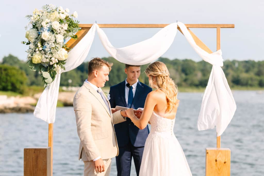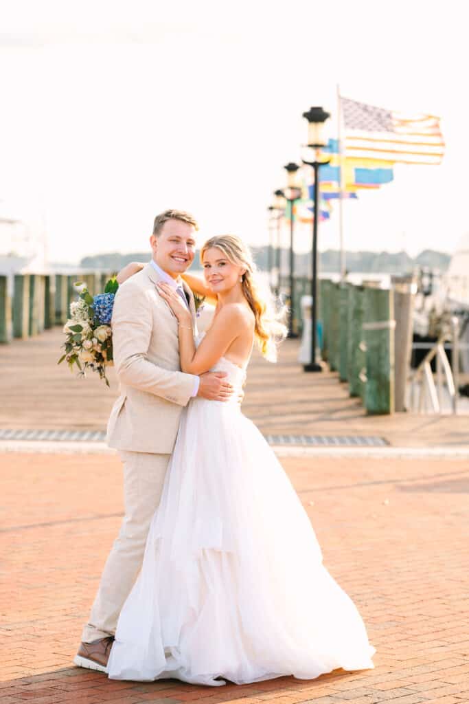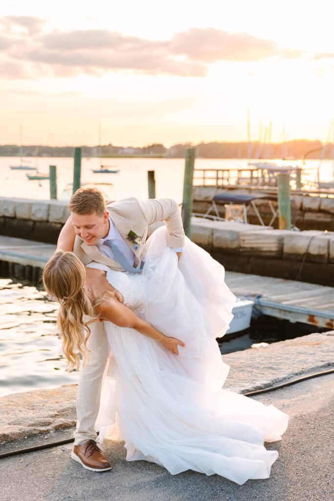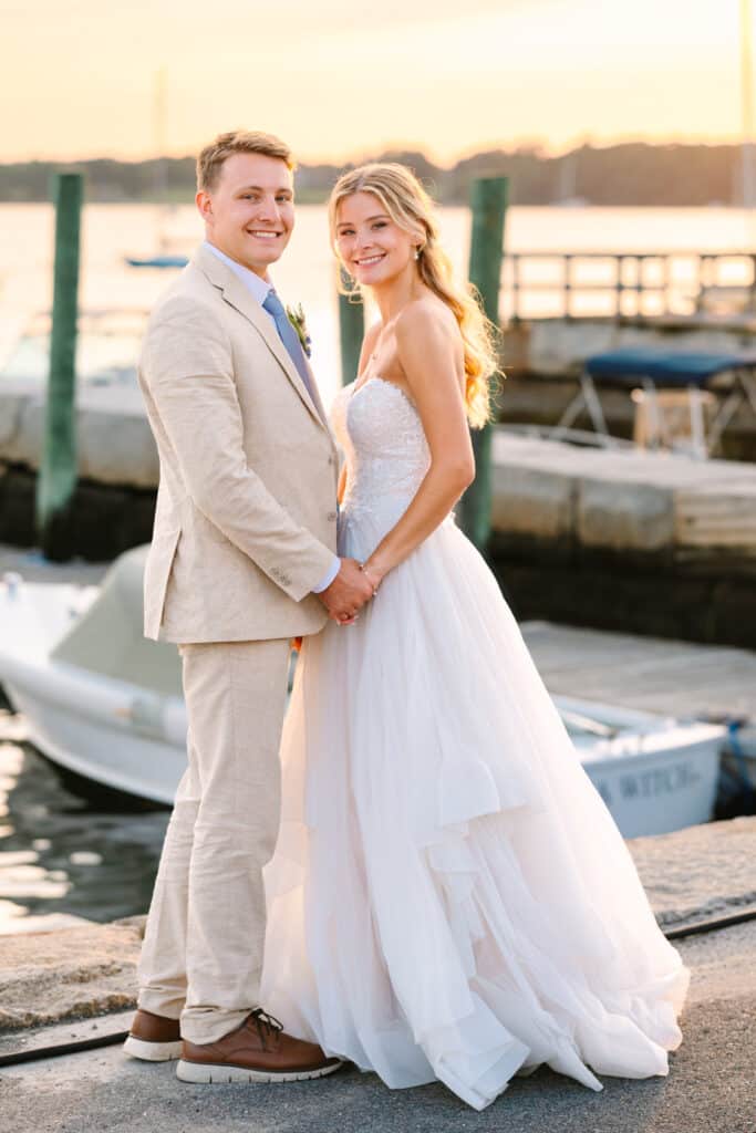 Their Herreshoff Marine Museum wedding ceremony took place right on the harbor dock, overlooking the sparkling waters of Bristol Harbor. Under the warm August sun, Tabitha and Jake exchanged heartfelt vows as their loved ones looked on. After the ceremony, we wandered along the museum’s docks, taking full advantage of the coastal scenery for portraits. The late summer light was absolutely magical, casting a golden glow across the water as the newlyweds shared quiet, joy-filled moments.