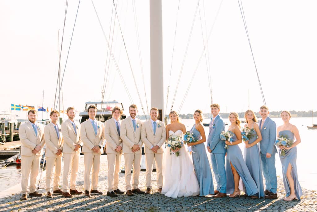 Tabitha and her bridesmaids spent the morning getting ready at a charming Airbnb steps away from the venue. In contrast, the groomsmen got ready in the museum’s iconic Hall of Boats, surrounded by the museum’s extraordinary collection of antique boats and sailing vessels. It was such a unique backdrop for wedding day preparations. Since the couple chose not to do a first look, we captured separate wedding party and family portraits before the ceremony, giving us extra time later in the day for relaxed, golden-hour portraits along the docks.