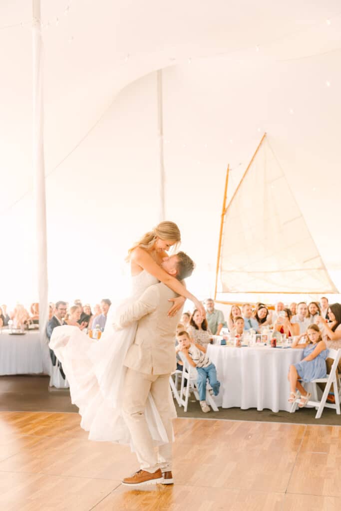 The Herreshoff Marine Museum wedding reception took place under a sailcloth tent, with a magnificent vintage sailboat on display, tying together the maritime theme of the day. Their first dance was pure romance, Jake twirling Tabitha as their guests cheered them on. The night ended with emotional toasts, joyful dancing, and a sunset that painted the sky in vibrant pinks, oranges, and golds. It was the perfect close to a perfect coastal celebration.