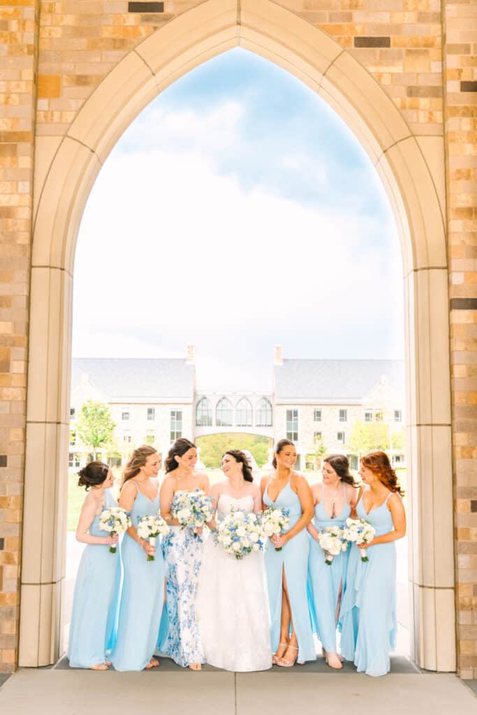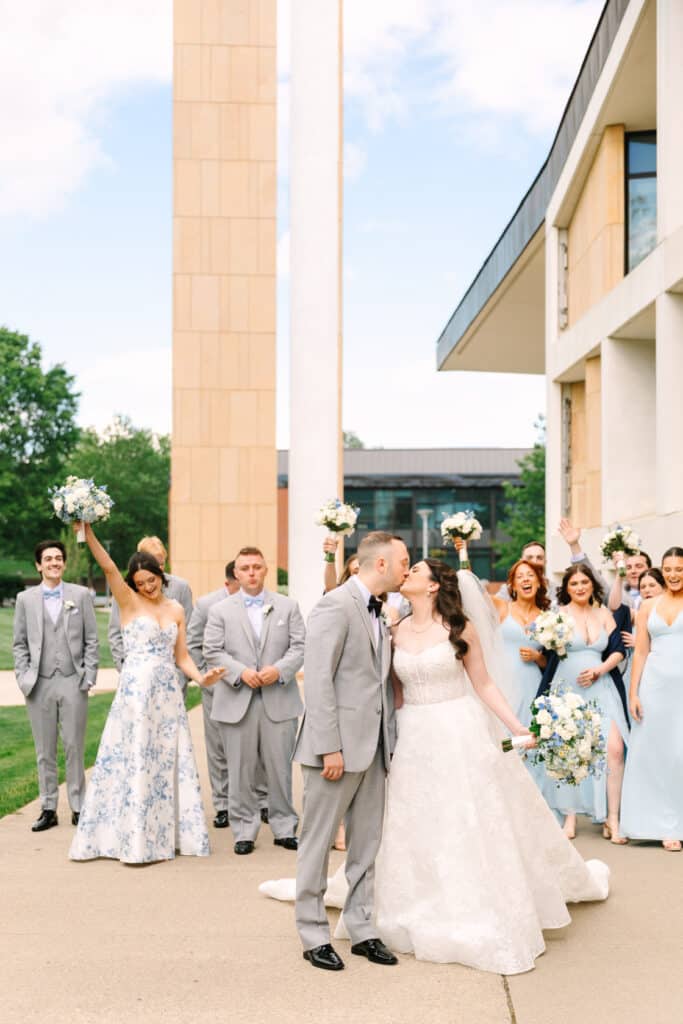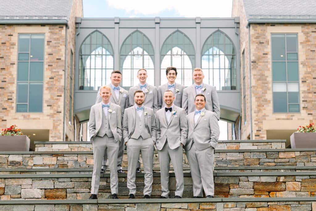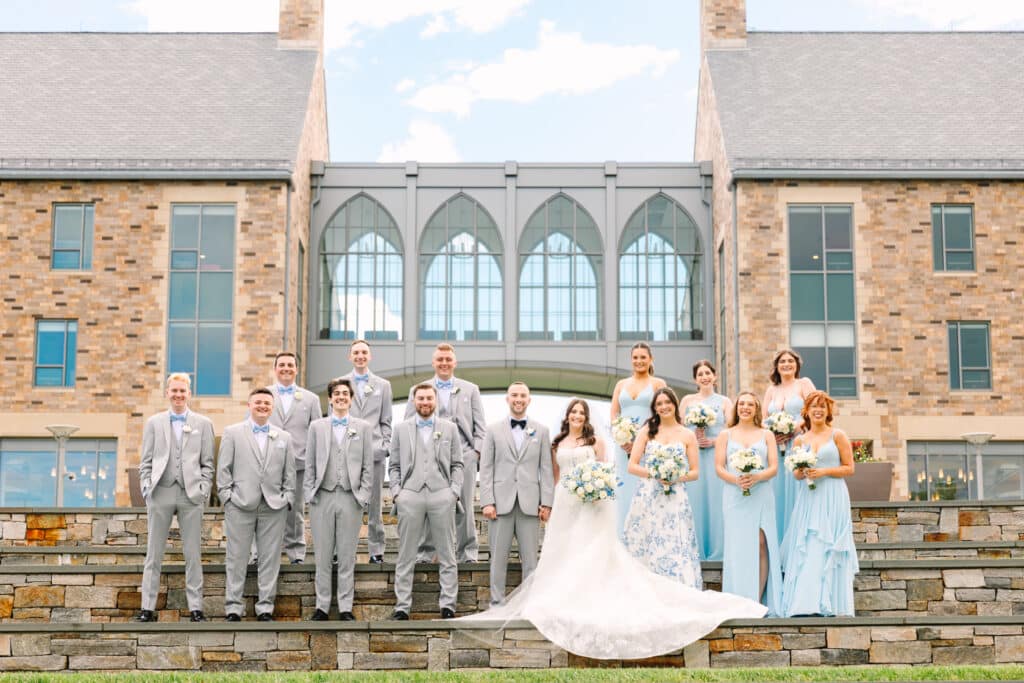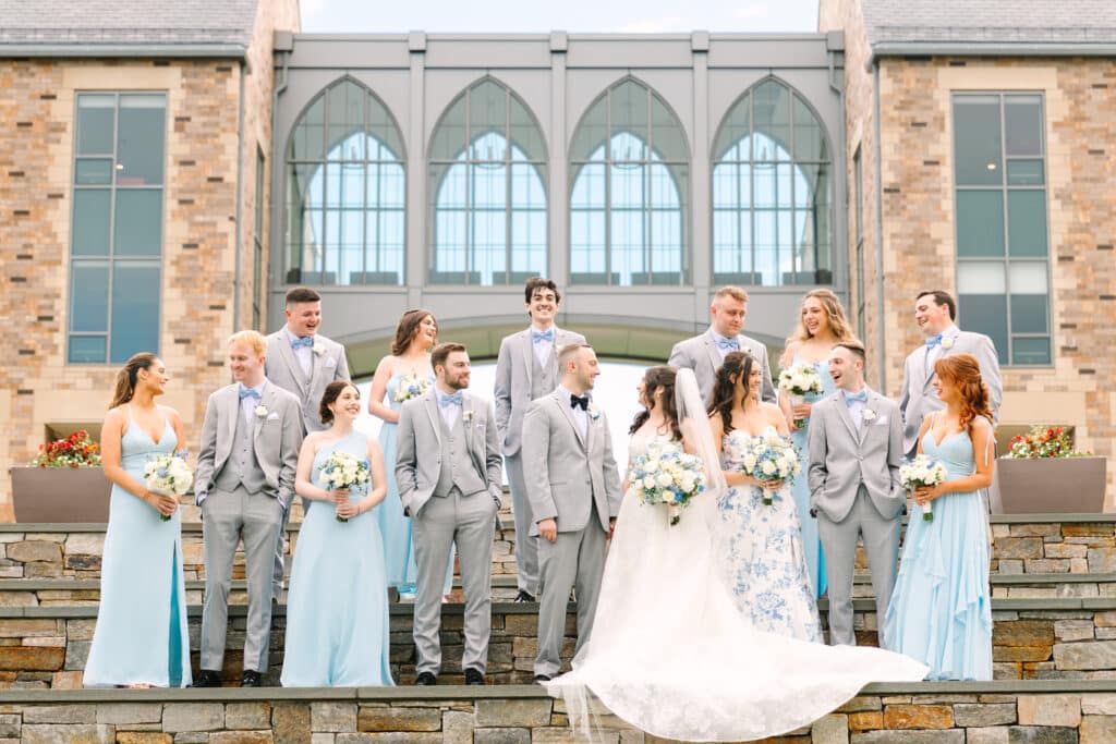 This Sacred Heart University wedding was a dream to capture. Photographing Nicole and Mike in such a personal and meaningful location added an extra layer of beauty and nostalgia to every moment. I wanted their images to feel sentimental and full of the joy that comes with returning to a place so deeply tied to their love story. Sacred Heart’s stunning architecture and serene atmosphere created the perfect canvas. One of my favorite spots was the grass covered stairs tucked behind the chapel, where we captured their iconic wedding party portraits. The clean lines of the stone provided a striking backdrop, while the staggered levels of the stairs made the portraits not only visually engaging but also dynamic—perfectly reflecting the energy and connection of the couple and their closest friends.