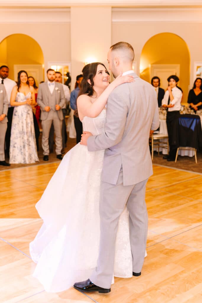 The Sacred Heart University wedding continued with Nicole and Mike exploring the university grounds with their wedding party, many of whom were friends they had met during their college years. The campus, with it’s contemporary design and Catholic inspired architecture, offered the perfect blend of elegance and sentimentality for portraits. The celebration continued at Great River Gold Club, where Nicole and Mike were whisked away in a golf cart to some of the venue’s most scenic spots for portraits. As the evening unfolded, their reception was filled with heartfelt toasts, emotional first dances, and an energy that grew more euphoric with every song. The night truly reflected the joy and love surrounding these two.