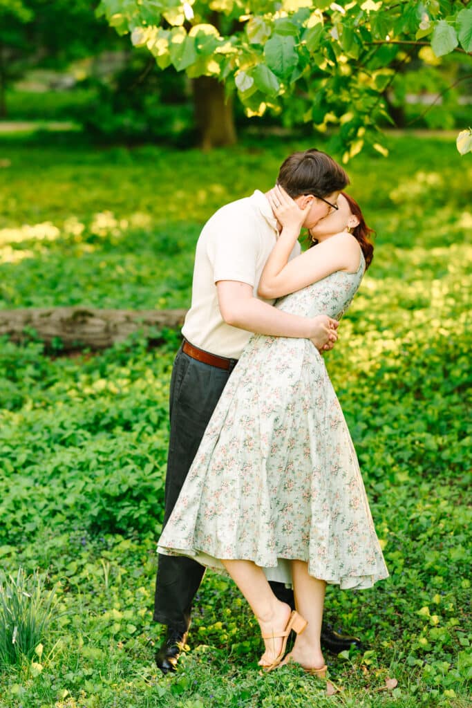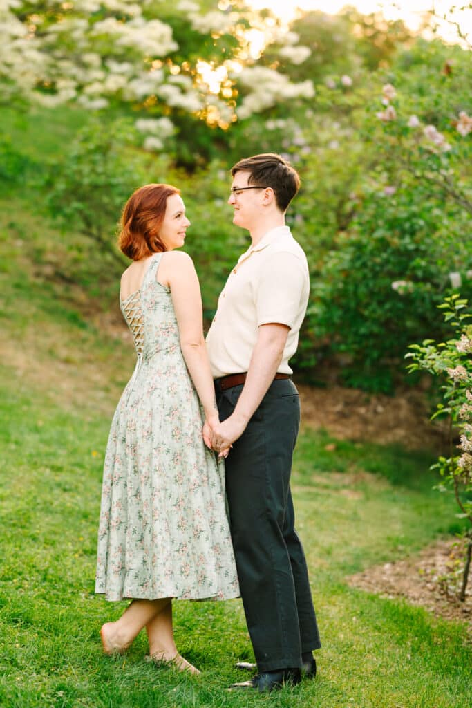 Spring is undoubtedly the Arboretum’s most enchanting season. In late March and early April, magnolias burst into bloom, followed by witch hazel and azaleas. By mid to late April, the cherry blossoms, crab apples, dogwoods, dove trees, rhododendrons, and clematis take center stage. Claire and Connor’s spring Arnold Arboretum engagement session took place in mid-May, when many of the spring blooms were still at their peak. Every corner of the Arnold Arboretum felt alive with color, the perfect setting for capturing their love story.