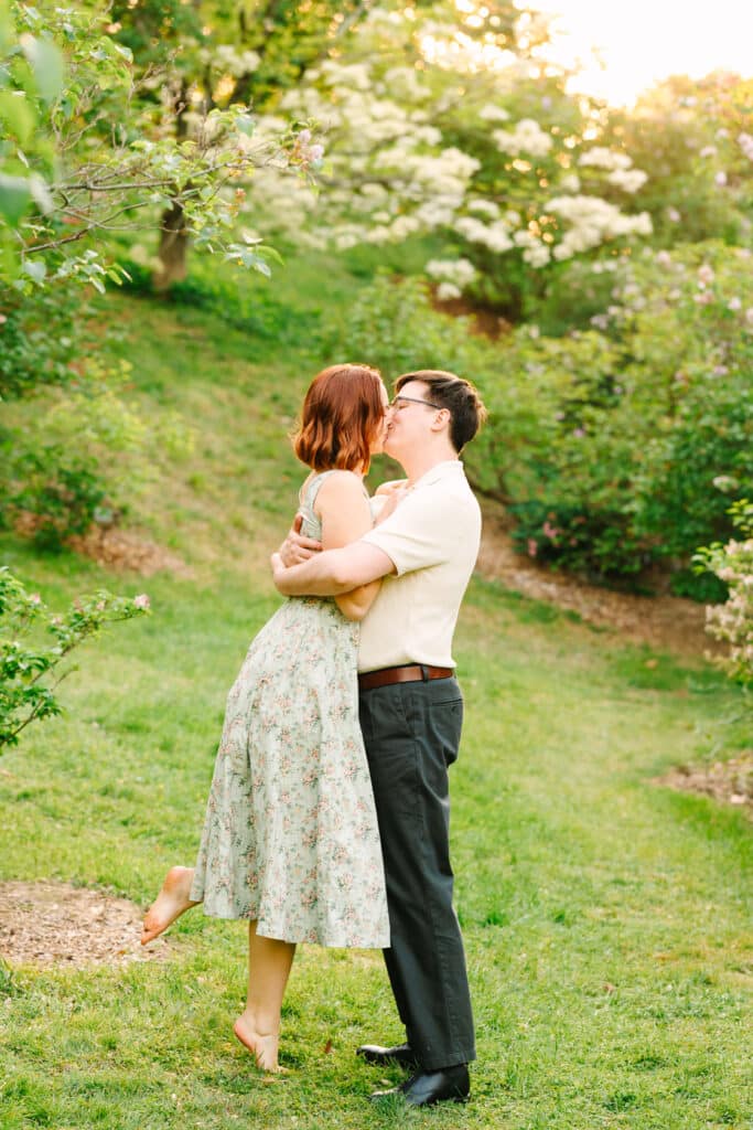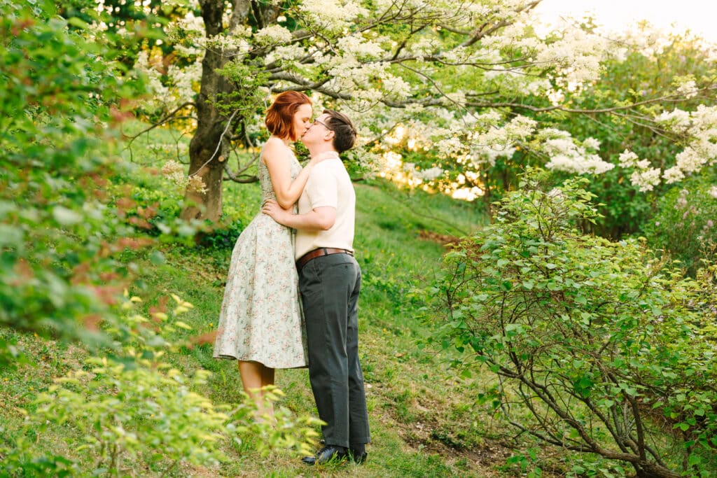 Claire and Connor had the most incredible spring Arnold Arboretum engagement session. Spring is when the Arnold Arboretum becomes truly otherworldly. The park bursts into color as the trees bloom, transforming into a dreamscape of soft petals and golden light. During their session, the golden hour glow filtered through layers of vibrant spring flowers, creating a scene that felt like something out of a fairytale.